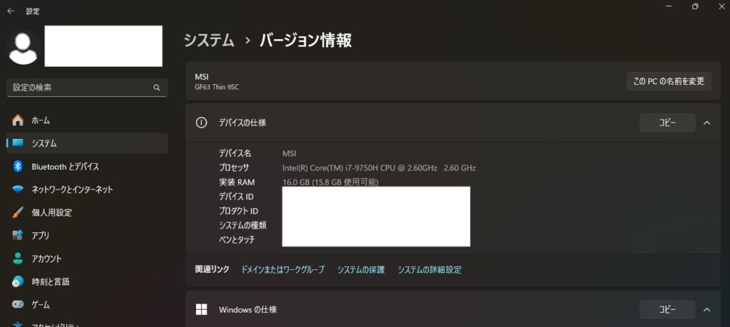 1. 「デバイスの仕様」セクションの下にある「システムの詳細設定」をクリックします。