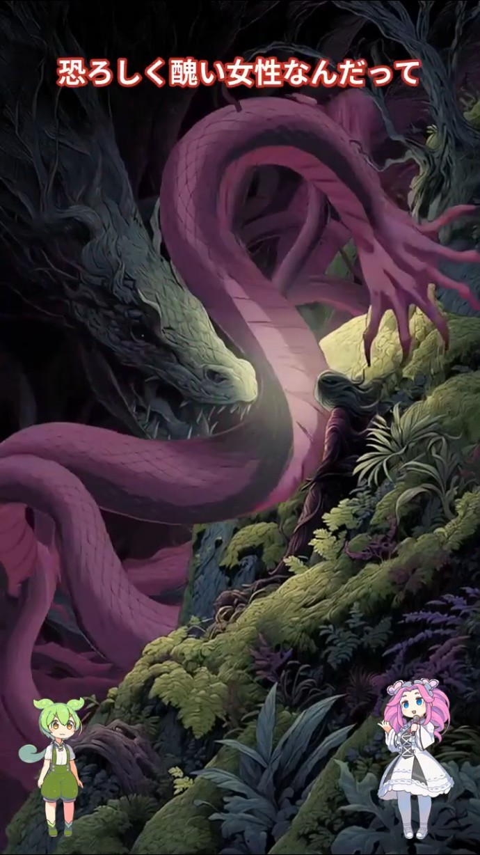 この精霊の本質は邪悪な女性なのですが、人々の前に現れる時は蛇やドラゴンの姿をとるという、二重の恐怖を持った存在なんです。
