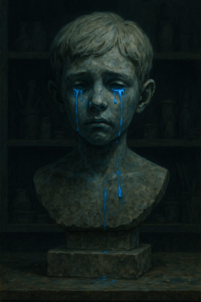 そこで彼が見たものは、とても恐ろしいものだったんです。行方不明になった友達の顔をした彫像が置かれていて、その目からは青い涙が流れていました。
