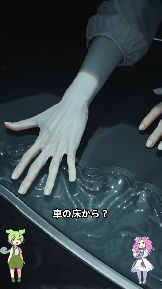 - 車の床から白い手が現れて運転手の足を掴む