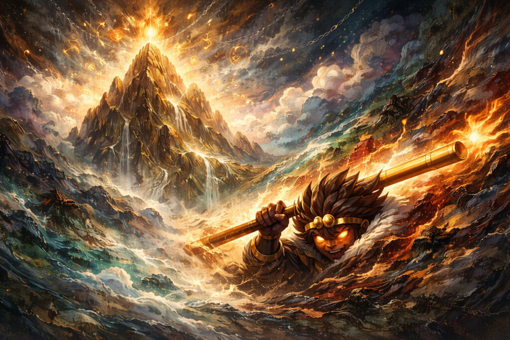 - 如意金箍棒:重さ約8トン、自在に大きさを変える武器