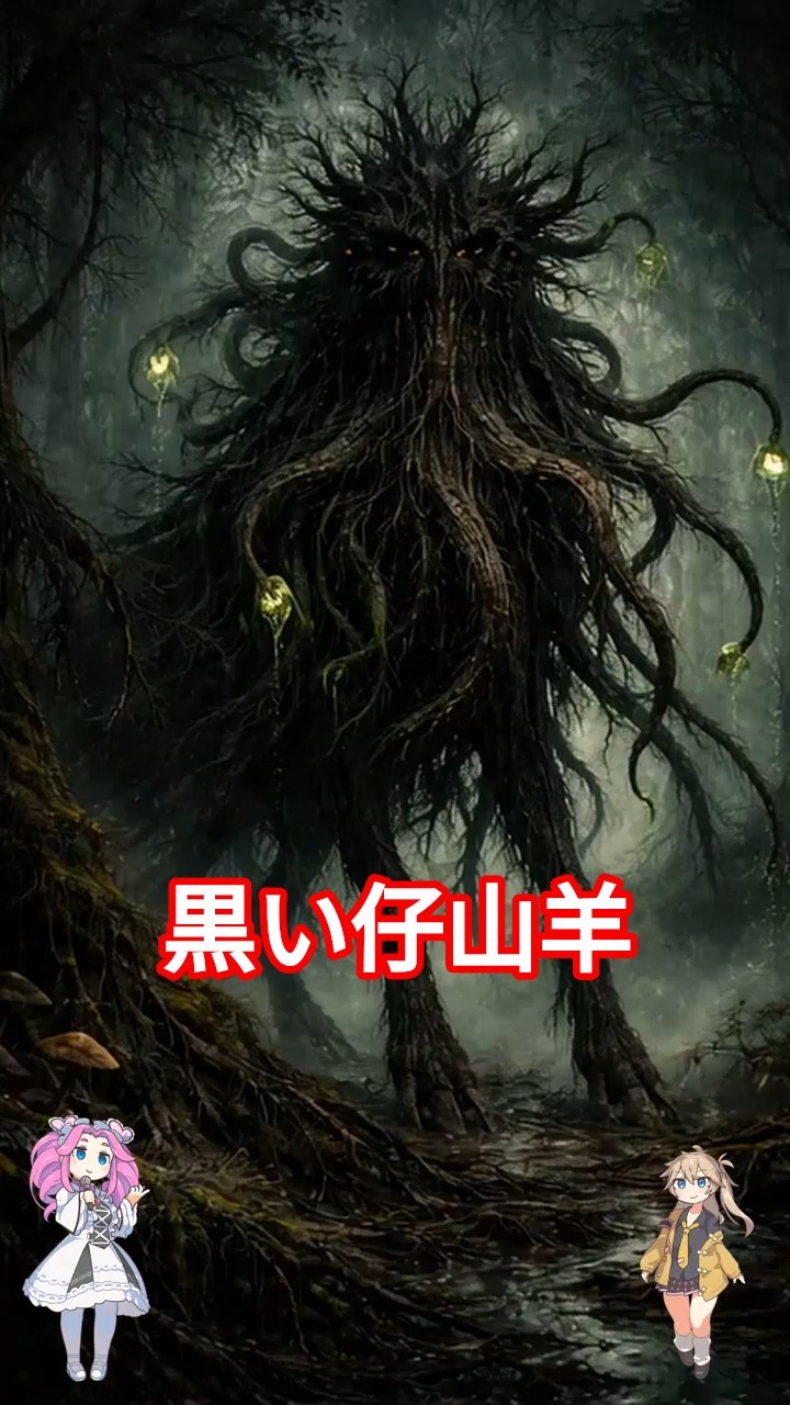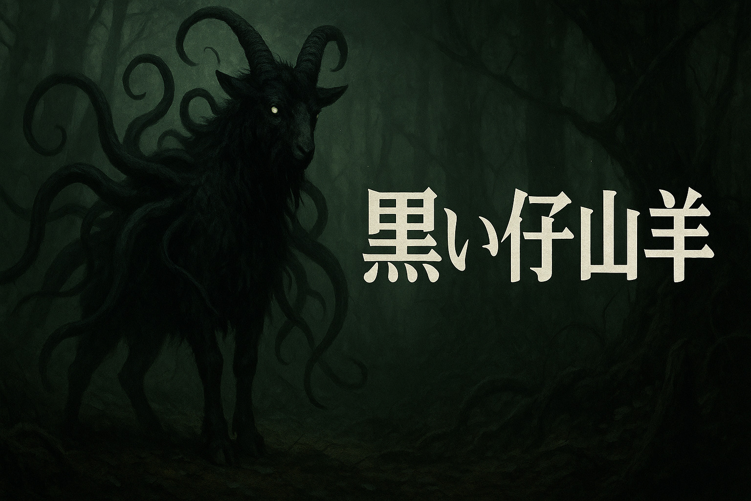木々の間を這うように動く黒い影、山羊のような蹄の音、そして不気味な触手のうねり…それは「黒い仔山羊」かもしれないのです。