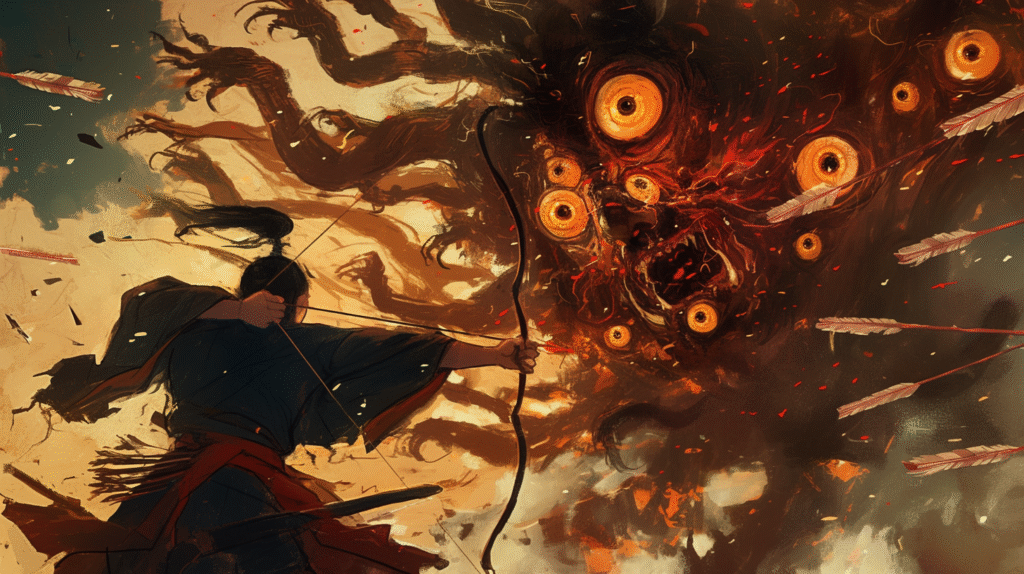 秀郷は得意の弓で百目鬼を狙いました。しかし、百目鬼は100の目で矢を見切り、なかなか当たりません。