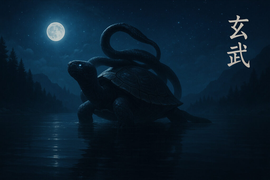 黒い甲羅を持つこの神獣は、水を司り、長寿をもたらし、冥界と現世を行き来する不思議な力を持つとされています。