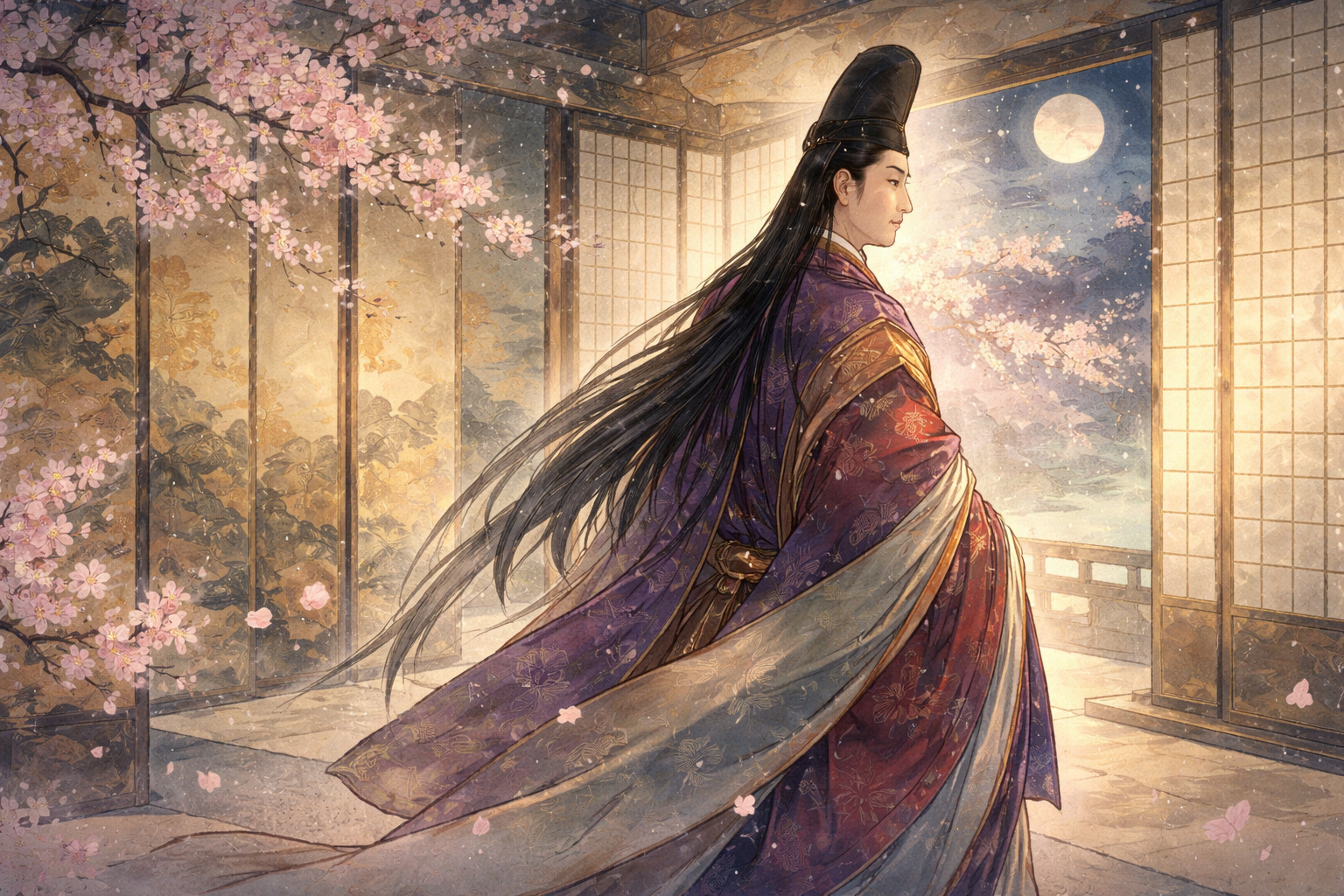 - 須磨・明石への退去:政治的失脚により都を離れるが、明石の君と出会う
