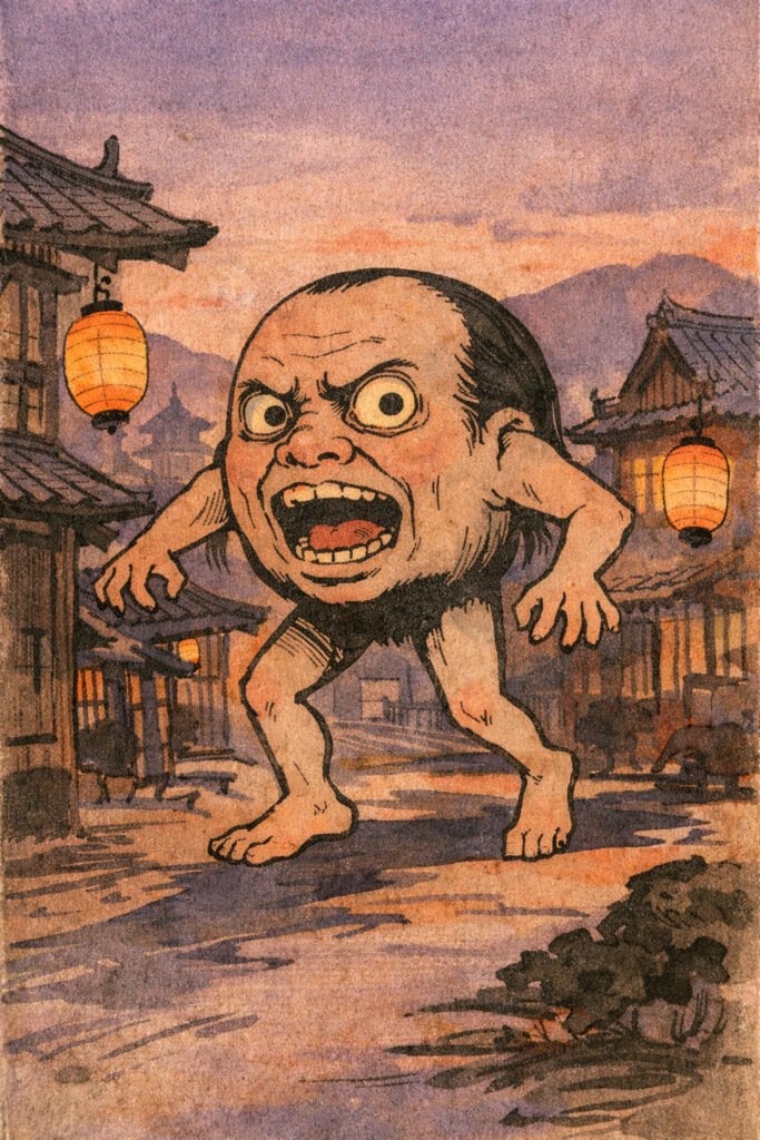 この妖怪の最大の特徴は、胴体が存在せず、巨大な人間の頭部に直接手足が生えているという異様な姿なんです。