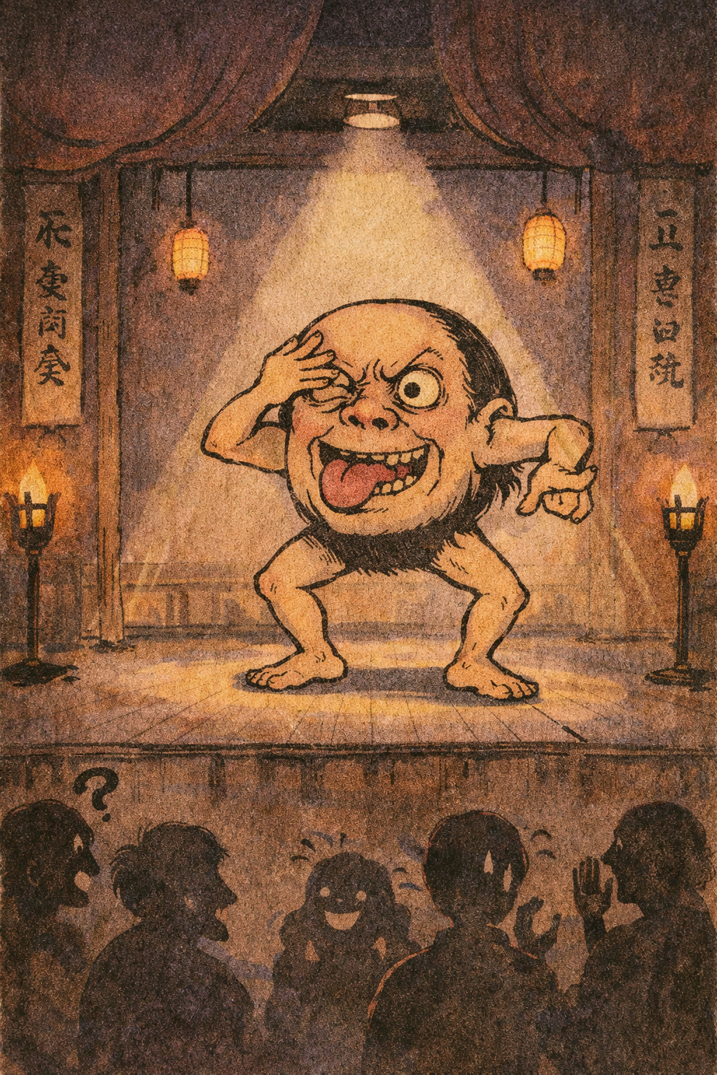 • 変な姿と百面相で人を笑わせようとする