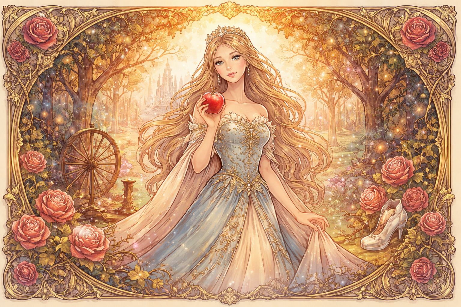 美しいだけでは幸せになれません。継母のいじめ、塔への幽閉、身分の剥奪——どの姫も何かしらの試練を経験しています。