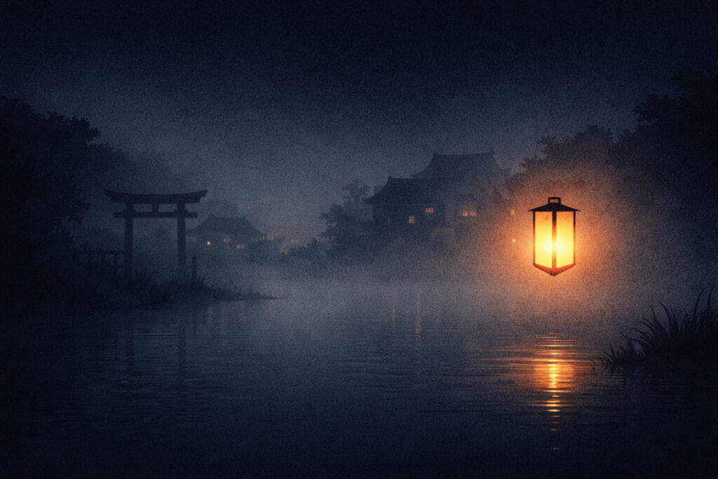 夜道を歩いていると、前方にぼんやりと提灯の明かりが見えます。