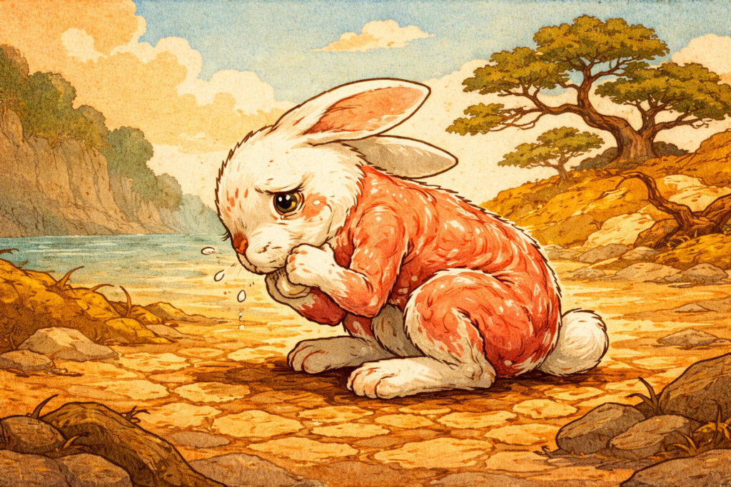 一行が因幡の気多之前に差しかかったとき、皮を剥がれて赤裸になった一羽の兎が泣いているのを見つけました。