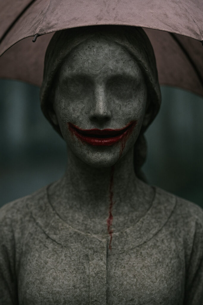 この姿を想像してみてください。目も鼻もない、のっぺらぼうのような顔に、真っ赤な口だけがある石像。しかも、ピンク色の傘という一見可愛らしいアイテムを持っているところが、逆に不気味さを増しているんですね。
