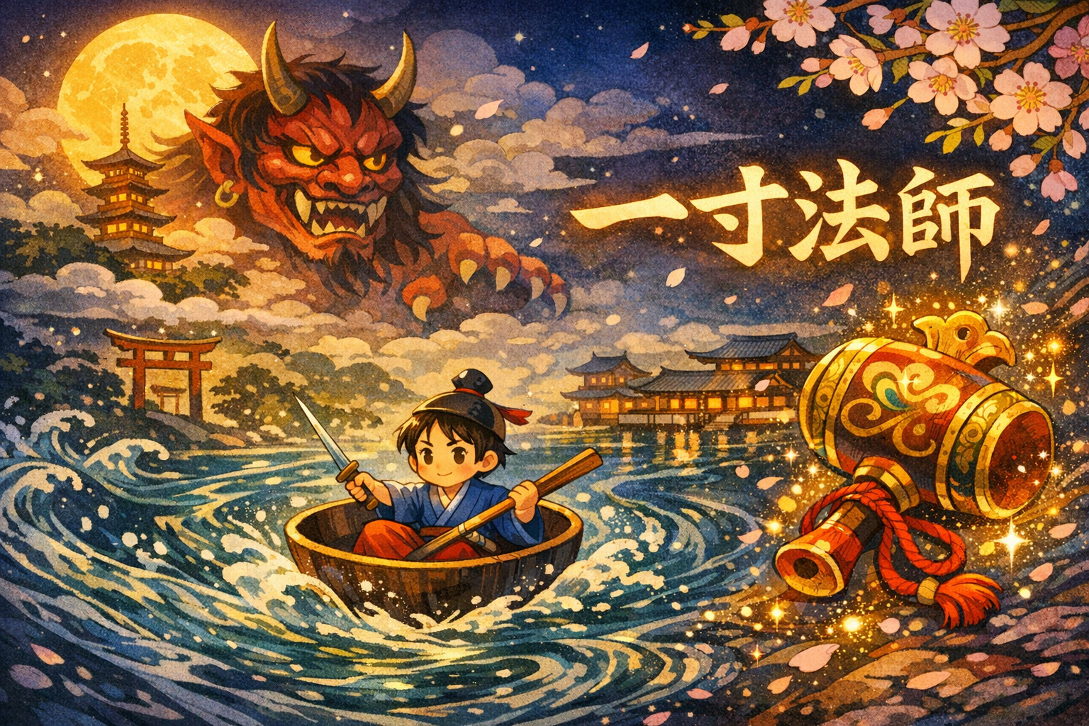 室町時代の短編物語集『御伽草子』に収録された物語がもとになっており、身長わずか一寸(約3cm)の小さな男の子が、知恵と勇気で鬼を退治し、最後は立派な若者になって出世するという物語として広く知られています。