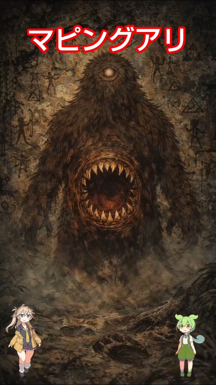 男が見たマピングアリは、クモザルのように毛深く、ロバのひづめのような足が逆向きについていて、ジャガーのような鉤爪を持っていました。口は異様に大きく、腹の位置まで裂けていたといいます。