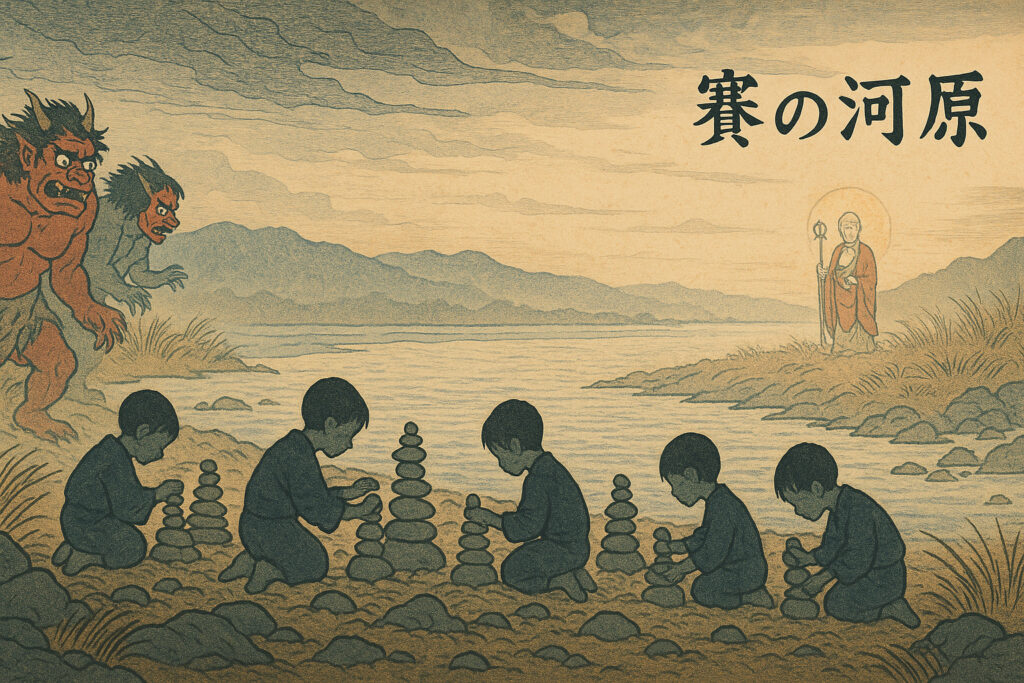 仏教と日本の民間信仰が結びついて生まれた独特の世界観で、親不孝の罪を償うために、子どもたちが石を積んで塔を作り続けるという言い伝えがあります。しかし完成する前に鬼が現れて壊してしまい、その繰り返しが永遠に続くのです。
