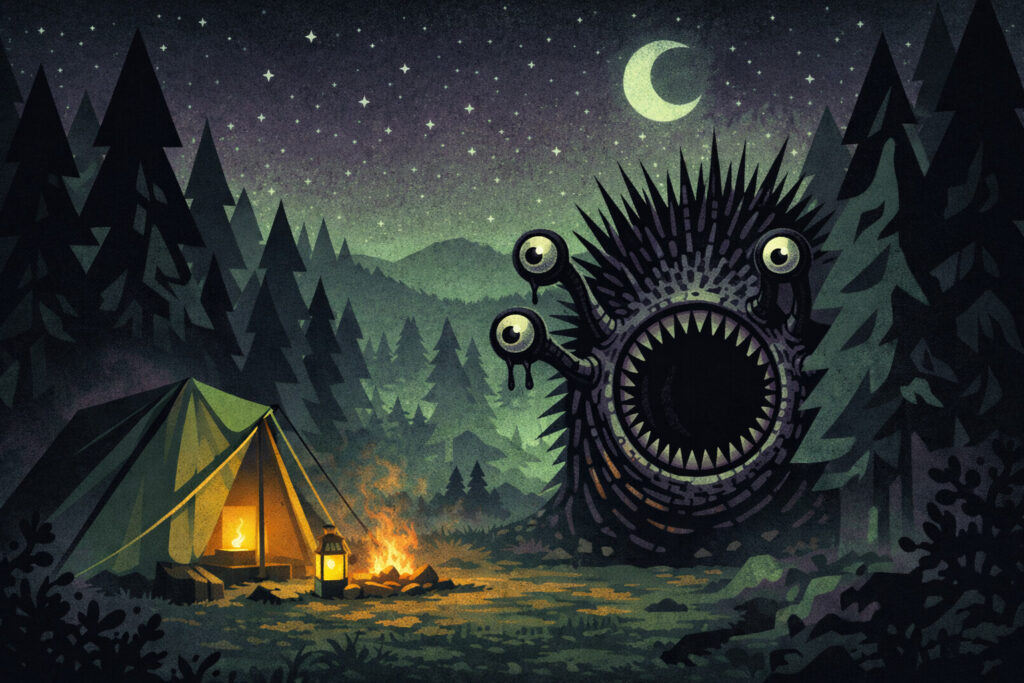 投稿者は慌てて逃げ出し、キャンプ場の管理人のもとへ駆け込みました。管理人と息を潜めていると、建物の周囲をうろつく怪物から不気味な声が発せられたそうです。
