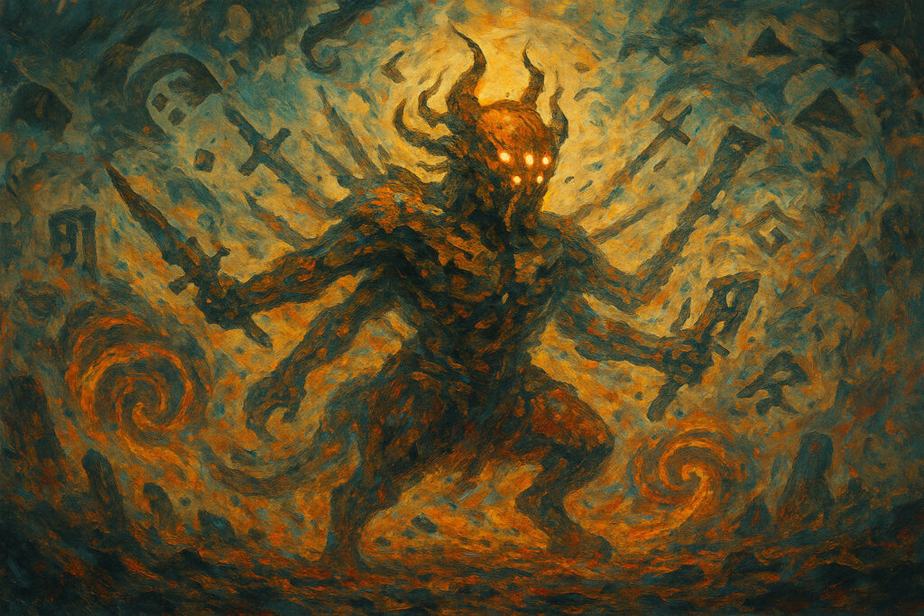 - 銅の頭、鉄の額、4つの目、6本の腕を持つ異形の姿