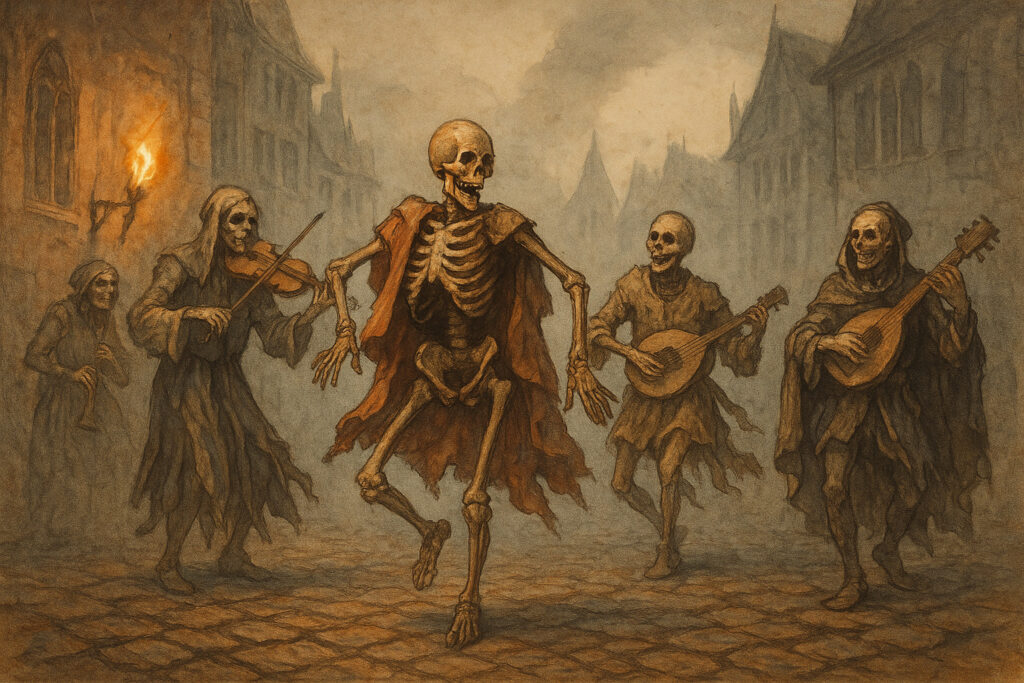 中世ヨーロッパの「死の舞踏」という芸術作品では、スケルトンたちが陽気に踊る姿が描かれています。