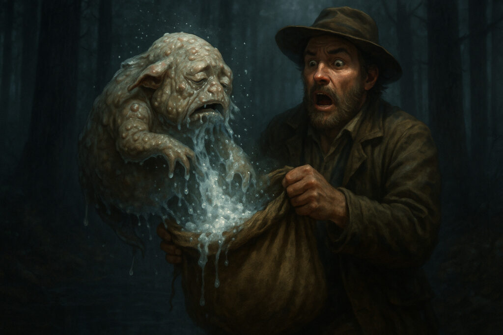 スクォンクを袋に入れて、意気揚々と家に持ち帰る猟師。ところが、歩いているうちに急に袋が軽くなり、泣き声も聞こえなくなりました。
