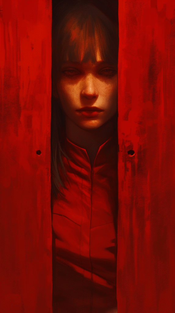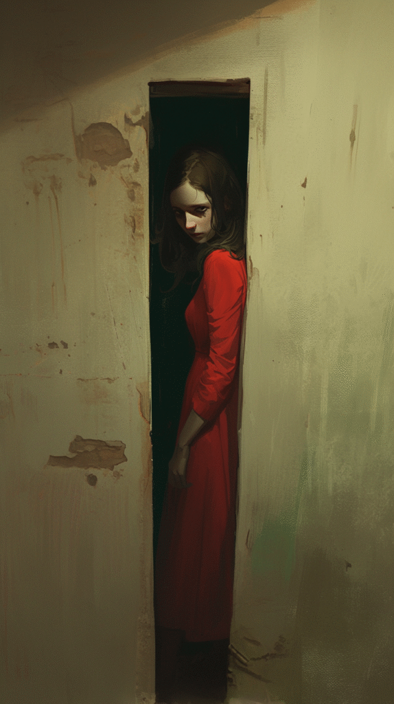 4. 隙間女の発見: タンスの隙間から赤い服の女性が覗いている