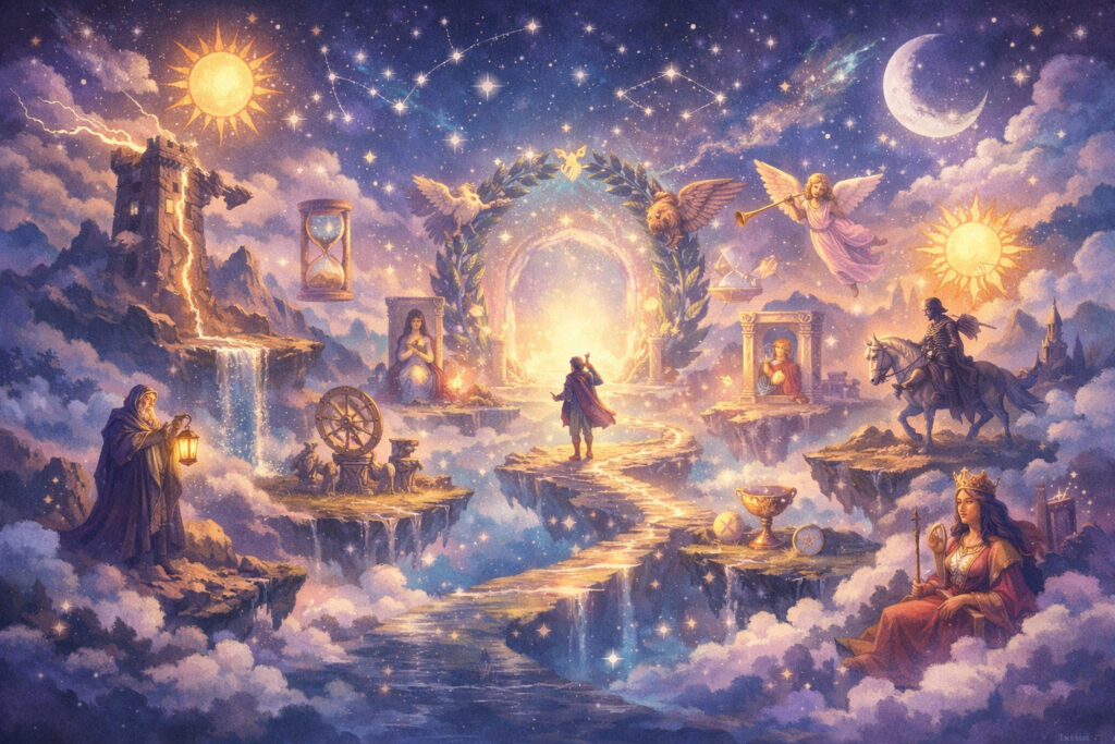 大アルカナは「愚者の旅」とも呼ばれ、人間の魂が成長していく過程を描いています。0番の「愚者」が旅に出て、さまざまな経験を経て、21番の「世界」で完成に至る——そんな壮大なストーリーです。