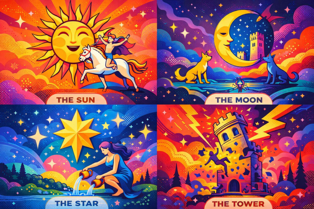 - 大アルカナ22枚:人生の大きな転機や成長のステージを表す