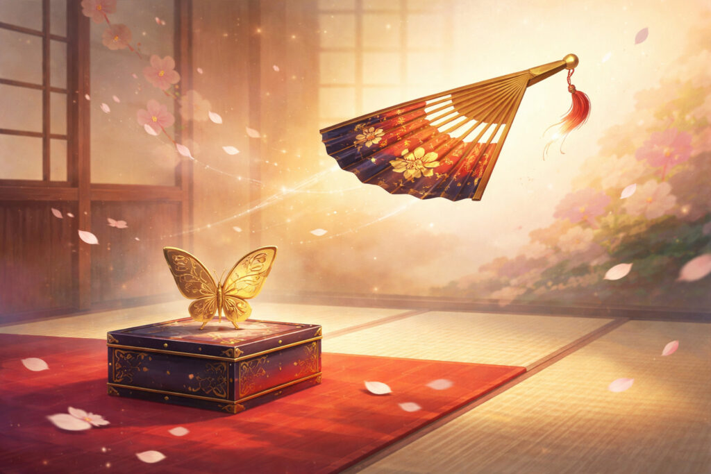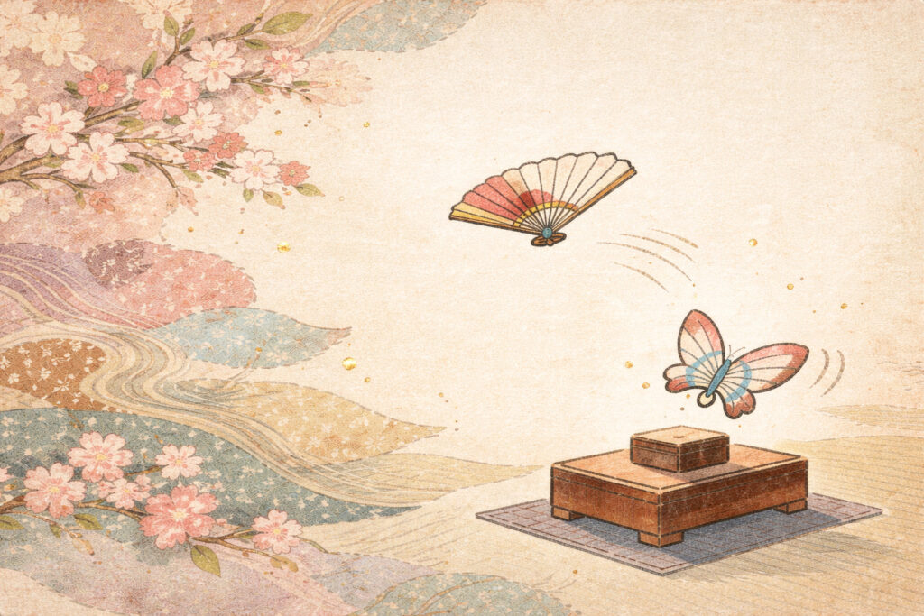 投扇興は、「枕(まくら)」と呼ばれる桐箱の台の上に「蝶(ちょう)」という的を立て、離れた位置から扇子を投げて的を落とすゲームです。