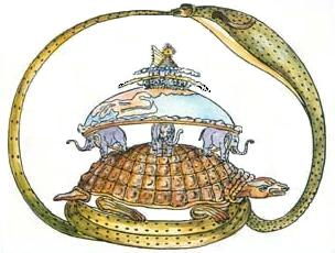 ヒンドゥー教では、世界を支える4頭の象がいて、その象は巨大なカメに支えられ、さらにそのカメを自分の尾をくわえた蛇が取り巻いているとされます。