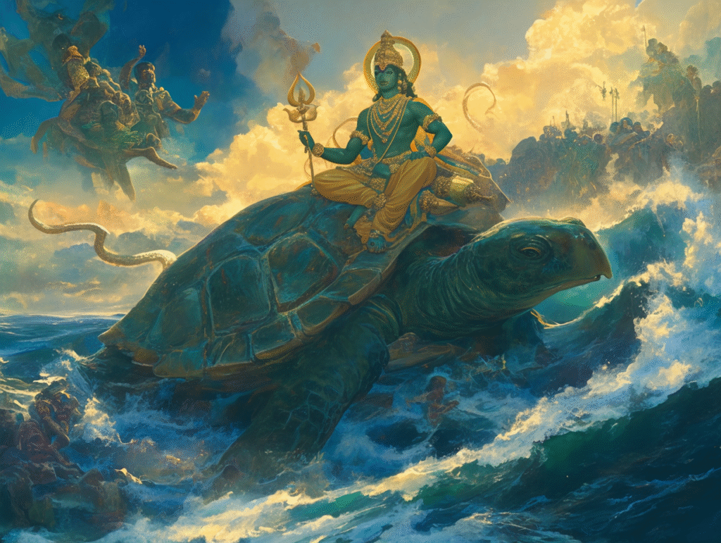 ヴィシュヌは巨大な亀「クールマ」に姿を変え、マンダラ山を背負って支えることで神々の手助けをした。