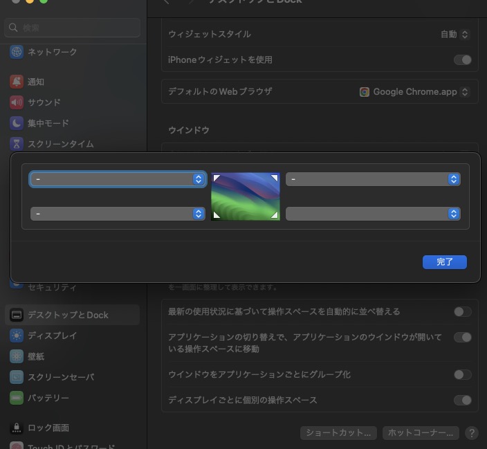 - 他のホットコーナー機能が設定されていないか確認