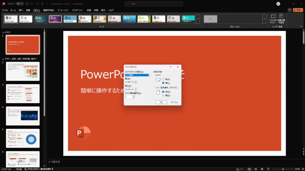 「スライドのサイズ」というウィンドウが表示されます。このウィンドウの中で以下の設定を行います: