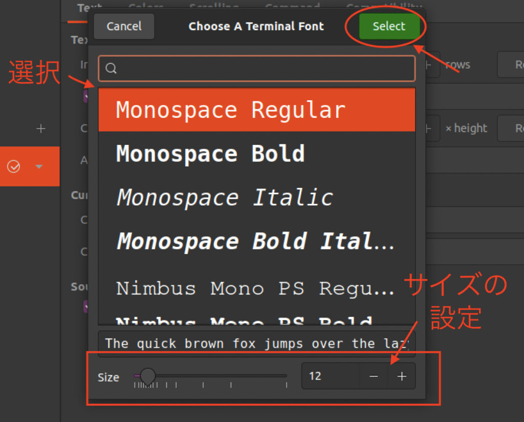 そして、一覧からテキストのフォントを選択し、下のSizeでテキストの文字サイズを設定します。