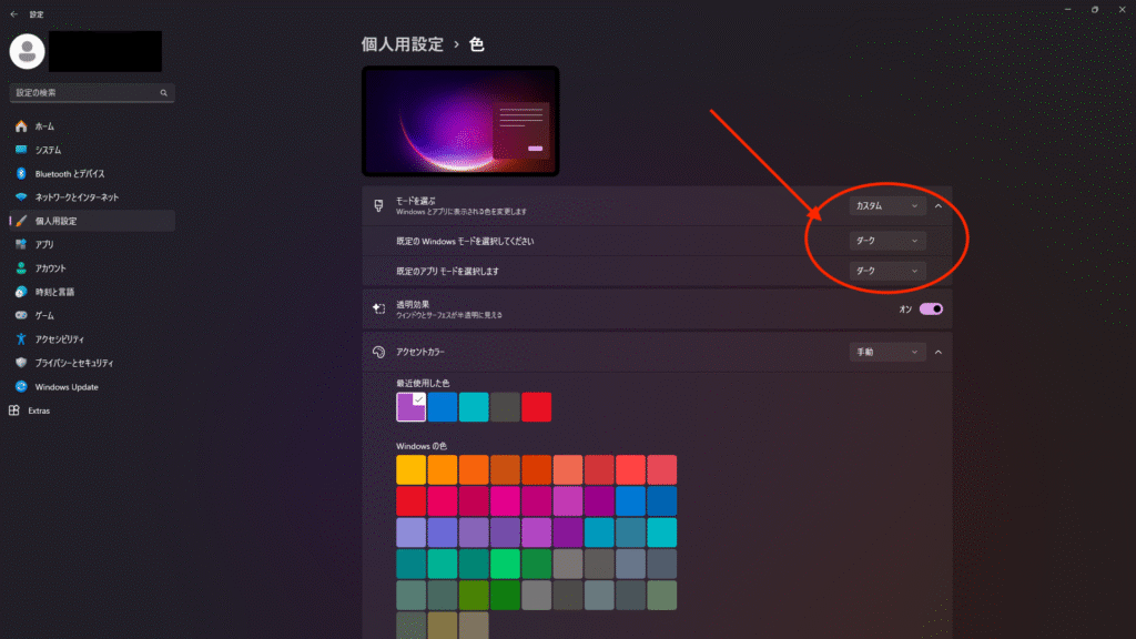 Windows 11では、ダークモードに関する設定が実は2つの独立した項目に分かれています。