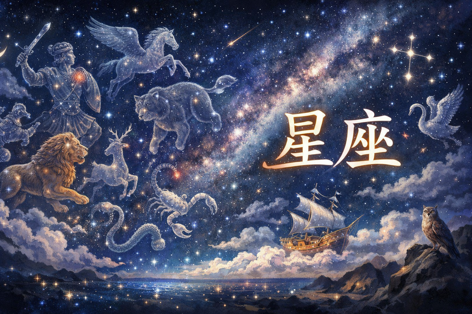 星座とは、夜空に輝く星々を線で結び、人や動物、神話の登場人物などの形に見立てたものです。