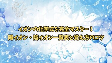 化学 イオンの化学式を完全マスター!陽イオン・陰イオン一覧表 「Na⁺とかCl⁻とか、記号がごちゃごちゃして覚えられない」 「硫酸イオンってSO₄²⁻?SO₃²⁻?どっちだっけ...」「そもそもイオンって何?原子と何が違うの?」 「テストで絶対出るのに、全然頭に入らない!」化学の授業で必ず登場するイオ... 化学科学